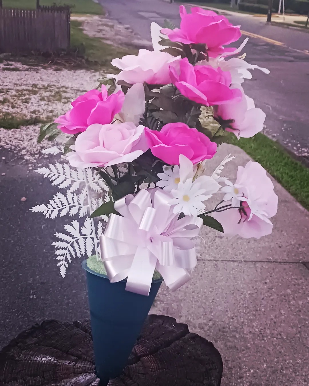 I was disappointed that I was never able to bring mommy home since she went to the hospital on April 7 (good Friday). Because all the funeral arrangements were out east we were not able to drive by where she currently resided. We come home from the funeral, and these flowers are on our street …