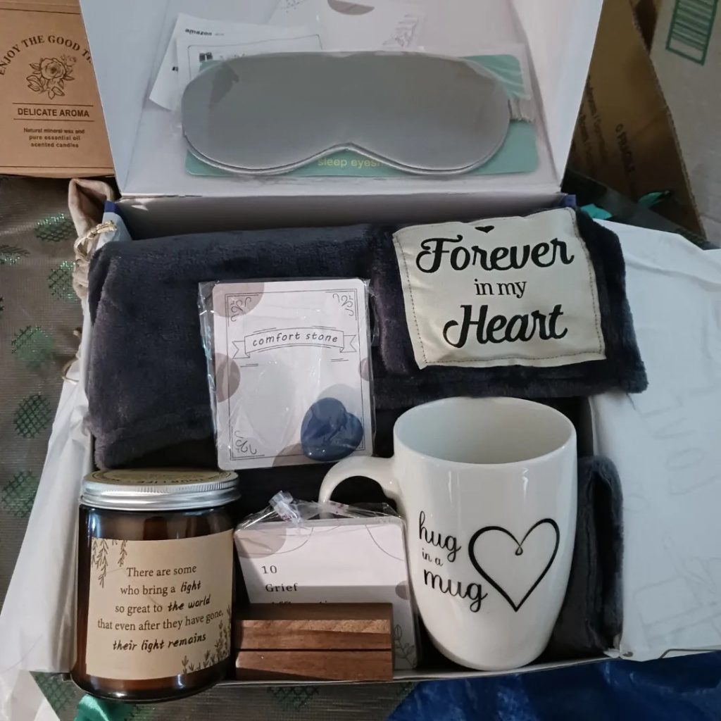 One is of the blue angel with a note that said “you were your mother’s angel” and a comfort box. I’ve been wanting a grief blanket. I got it! The candle smells like how my grandparents house used to smell. And though I don’t believe in healing stones, the fact that it’s a blue heart is what I hold onto.The “hug in a mug” is a gift me and mom made for her last holiday season here.